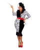 Sultry Dalmatian-Print Midi Dress: This sexy Cruella de Vil costume includes a Dalmatian-print midi dress with a front zipper feature, a sheer bottom hem, and a black faux-fur collar, capturing Cruella's iconic style.